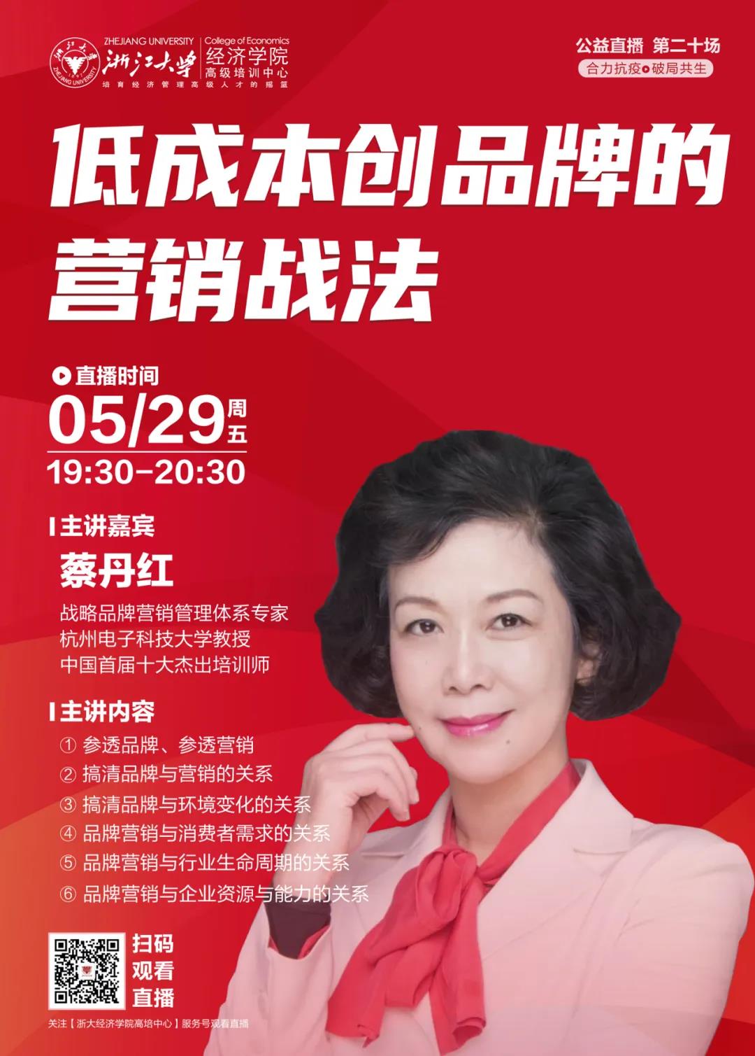 在此次疫情之后,蔡丹红老师联合浙大经济学院高培中心推出的品牌营销系列课将会为企业发展助力,从品牌发展和消费者需求等层面为企业“降本增效”。同时也会为当今“再小的个体,也有自己的品牌”的个人品牌打造提供全新的思路和实操方法论。
