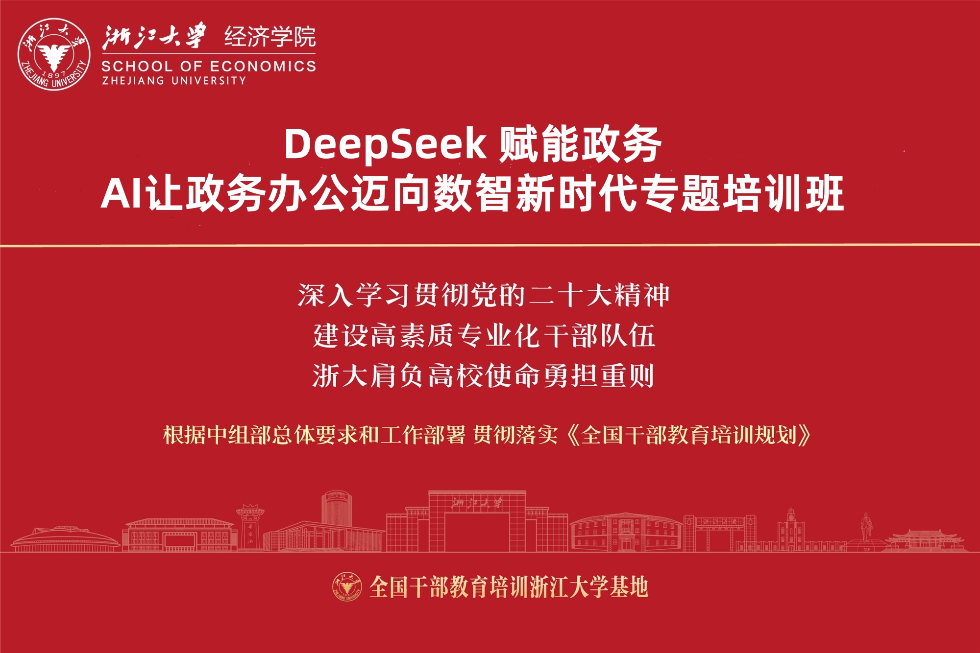 在数字化浪潮的推动下,人工智能技术正成为推动政府治理能力现代化的关键引擎。为深入贯彻落实党中央关于 “加快数字政府建设” 的战略部署,全面提升政务办公人员对大数据、人工智能等前沿技术的认知水平与应用能力,促进科技创新与政务工作深度融合,浙江大学经济学院高级培训中心特举办 “DeepSeek 赋能政务,AI让政务办公迈向数智新时代” 专题培训班。