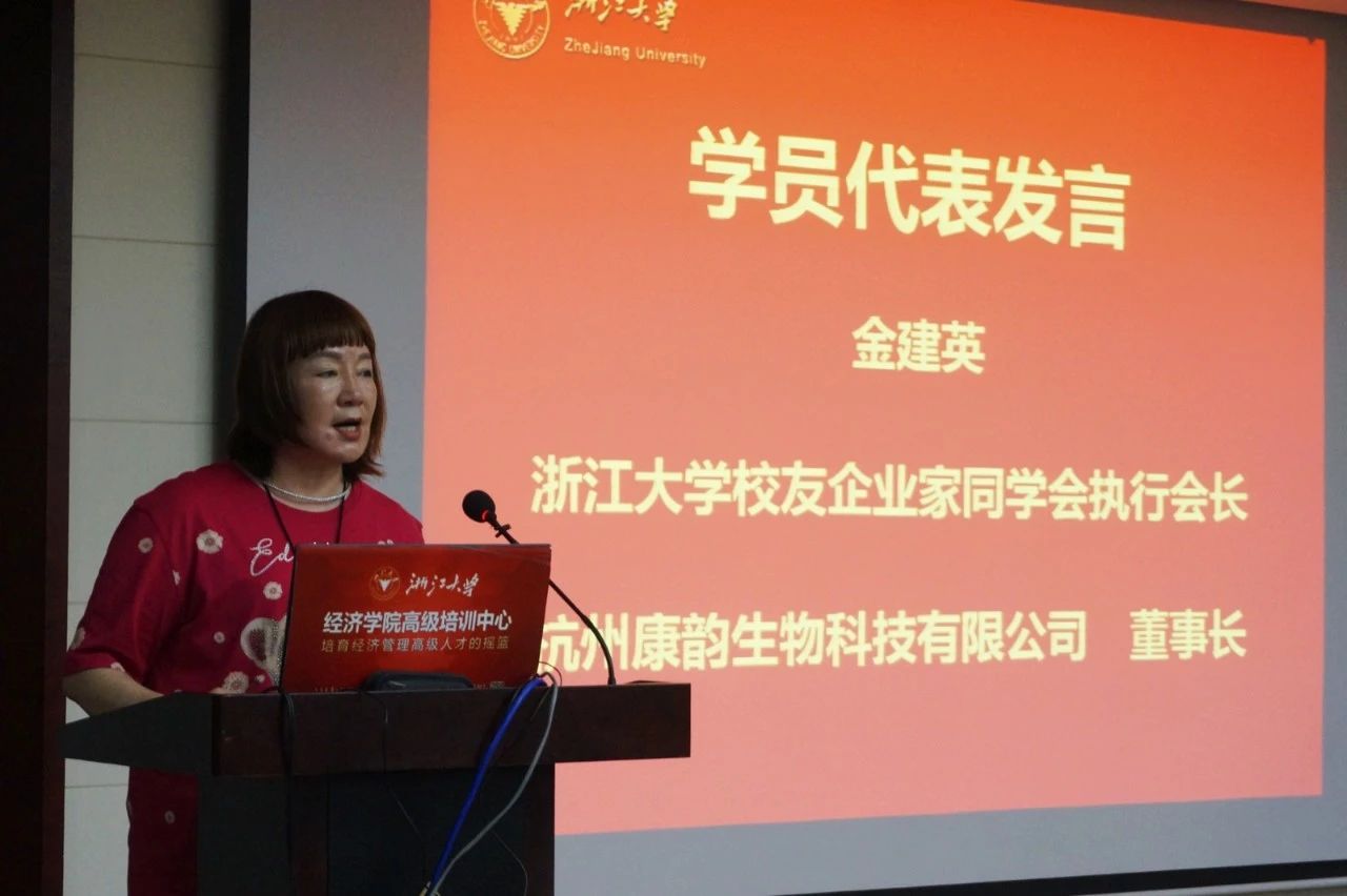 我自我介绍一下:我是金建英,杭州康韵生物科技股份有限公司董事长,我应该已经是第五次参加CCE中心的课程了,今天很荣幸受中心委托,谨代表浙大经济学院投融资实战首期班发言,欢迎大家的到来!