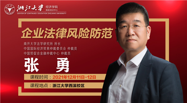 课程名称:《企业法律风险防范》,课程时间:2021年12月11日-12日,授课老师:张 勇,南开大学法学研究所 所长,中国国际经济贸易仲裁委员会 仲裁员,中国贸促会金融仲裁中心 仲裁员。