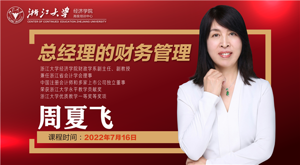 课程名称:《总经理的财务管理》课程时间:2022年7月16日,授课老师:周夏飞,浙江大学经济学院财政学系副主任、副教授,兼任浙江省会计学会理事,中国注册会计师和多家上市公司独立董事,荣获浙江大学永平教学贡献奖 浙江大学优质教学一等奖等奖项。