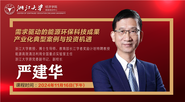 课程名称:《需求驱动的能源环保科技成果产业化典型案例与投资机遇》 课程时间:2024年11月16日(下午) 上课地点:浙江大学西溪校区 授课老师:严建华 浙江大学教授,博士生导师 教育部长江学者奖励计划特聘教授 能源高效清洁利用全国重点实验室主任 浙江大学原党委副书记、副校长