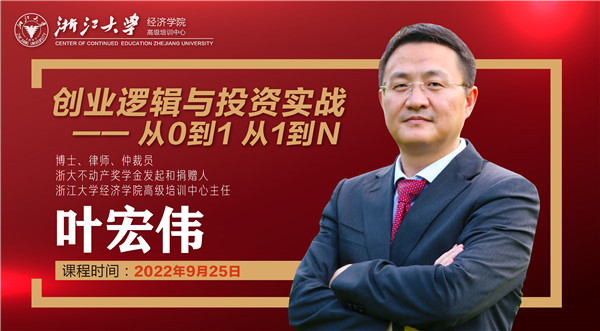 课程名称:《创业逻辑与投资实战——从0到1 从1到N》课程时间:2022年9月25日,授课老师:叶宏伟,博士、律师、仲裁员,浙江大学经济学院高级培训中心主任。