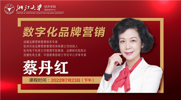课程名称:《数字化品牌营销》,课程时间:2022年7月23日下午,授课老师:蔡丹红,战略品牌营销管理体系专家,杭州丹焱品牌营销管理咨询有限公司创始人,杭州电子科技大学管理学院教授、品牌研究院院长,民建杭电主委、中国教育部硕士学位中心评审专家。