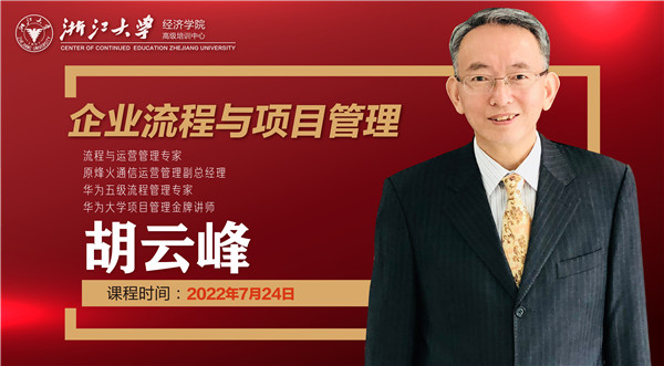 课程名称:《企业流程与项目管理》课程时间:2022年7月24日,授课老师:胡云峰,流程与运营管理专家 ,原烽火通信运营管理副总经理,华为五级流程管理专家华为大学项目管理金牌讲师。