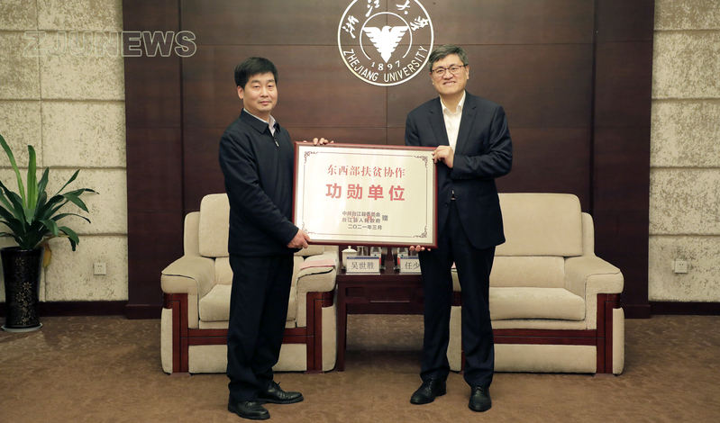 3月30日,校党委书记任少波在紫金港校区会见黔东南州人大常委会副主任、台江县委书记吴世胜一行。吴世胜代表台江县向浙江大学赠予东西部扶贫协作功勋单位铭牌。